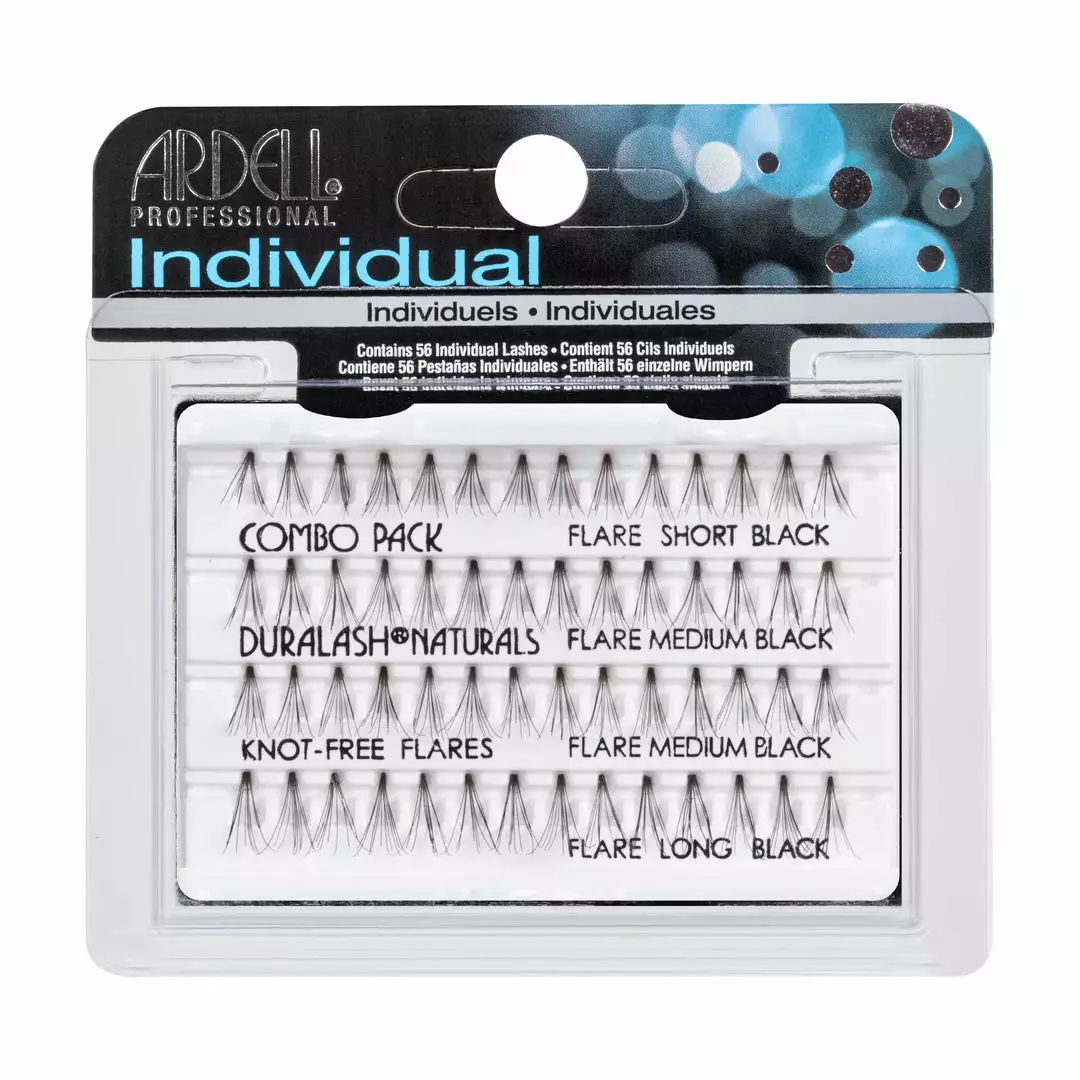 Ardell Knot-Free Individual Lash Set features a combination of short black, medium black and long black individual lashes.