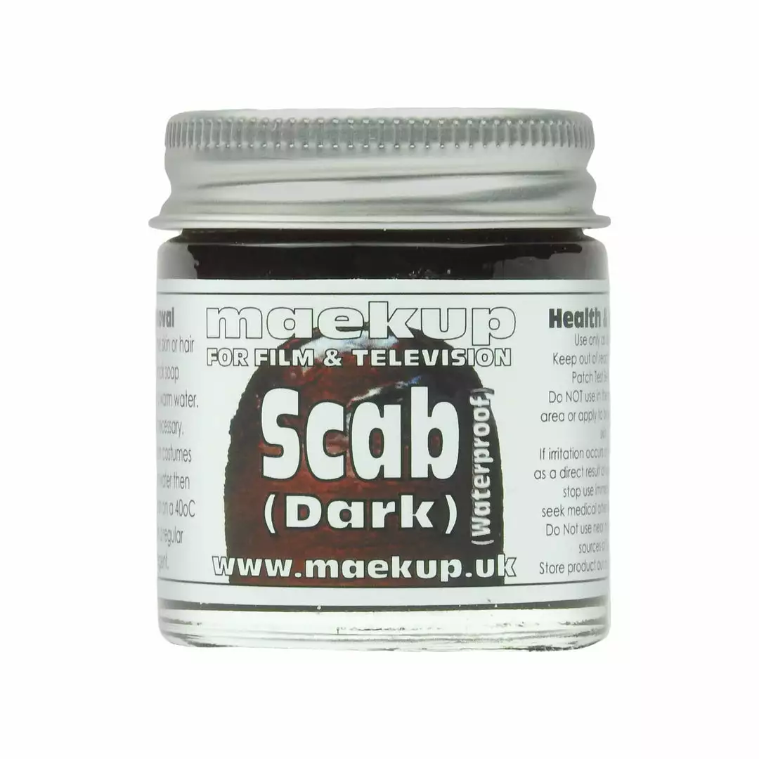A waterproof version of the classic Maekup Scab – a thick isopropyl alcohol based gel for creating aged scratches and old dried blood FX directly on the skin, use with Dried Blood and a Probondo wound for ultra realistic FX.
