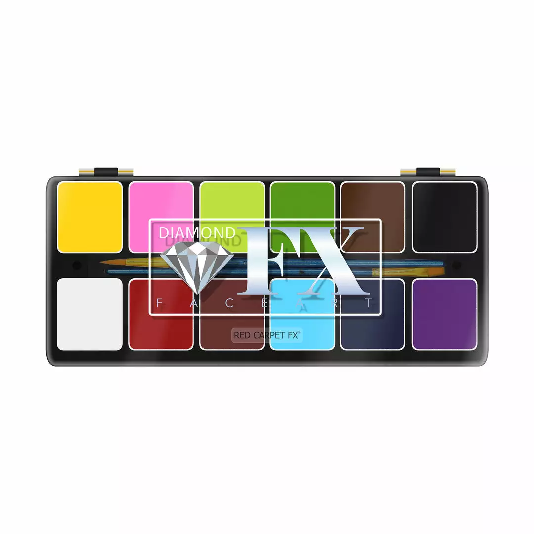 The Diamond FX Essential 12 Palette contains 12 colours that are ideal for all face & body painting applications. Containing a full spectrum of colours including yellow, pink, greens, brown, black, white, reds, blues and purple.