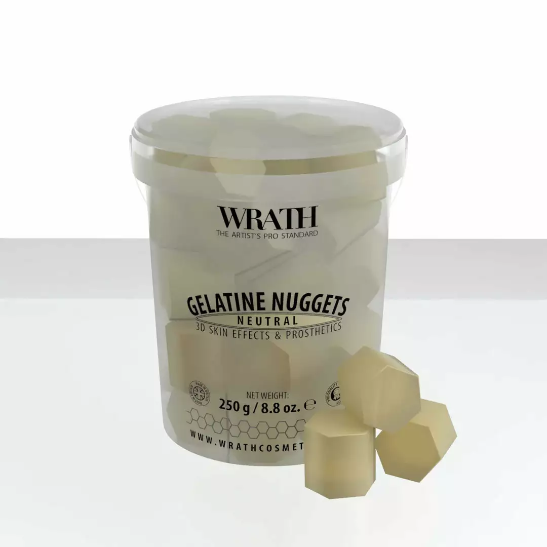 Directions for use; to apply, heat the nuggets by using the instructions below. Once heated, apply any pigmentation required and either apply directly to skin (allow to cool prior to application on skin) or pouring into prosthetic mould. Edges may be blended out into skin using WRATH Witch Hazel. Powder after application to remove natural tackiness of gelatine. Heat Gelatine Nuggets in the microwave by gently heating them in a microwavable container 5 to 15 seconds at a time, stirring in-between, until reaching a smooth, thick liquid consistency. Do not overheat; overheating may damage Gelatine Nuggets, rendering them unusable. If bubbling occurs, immediately stop heating.