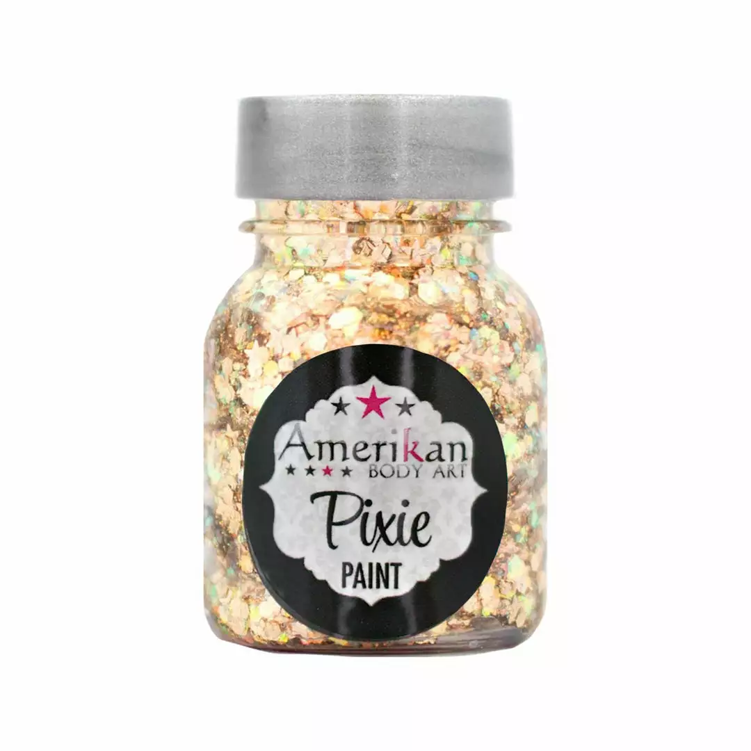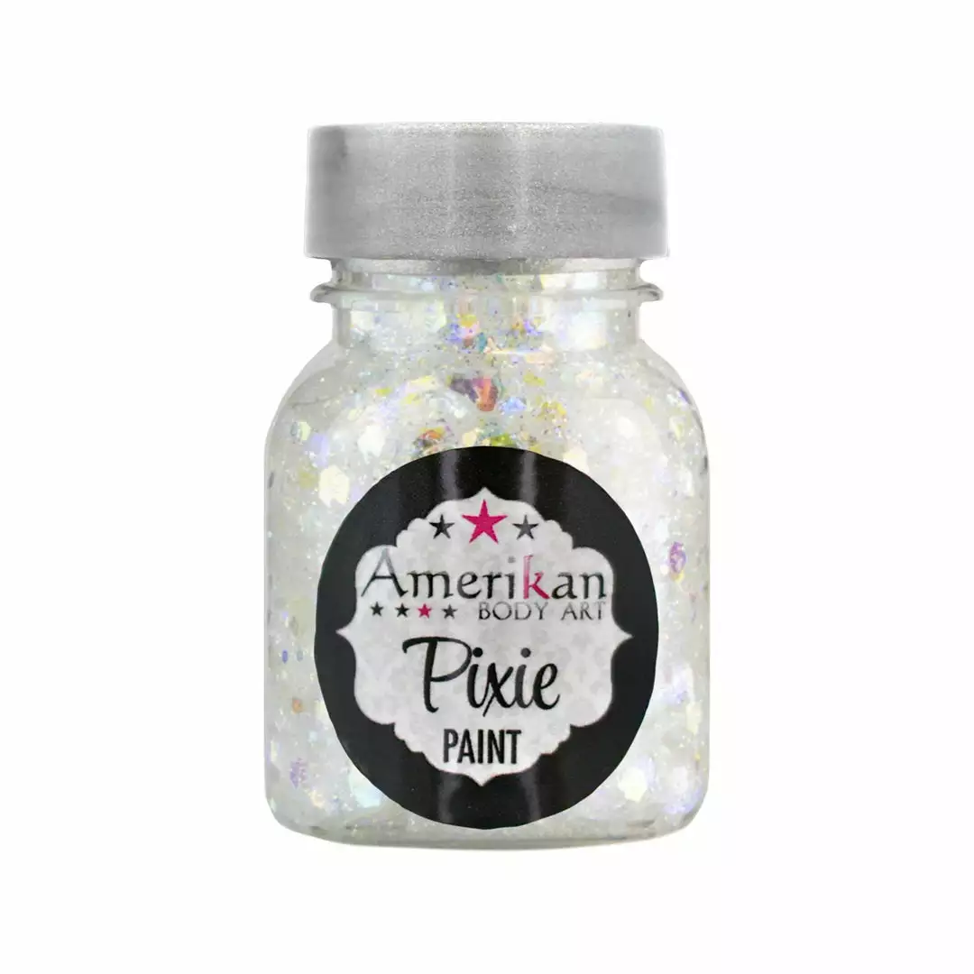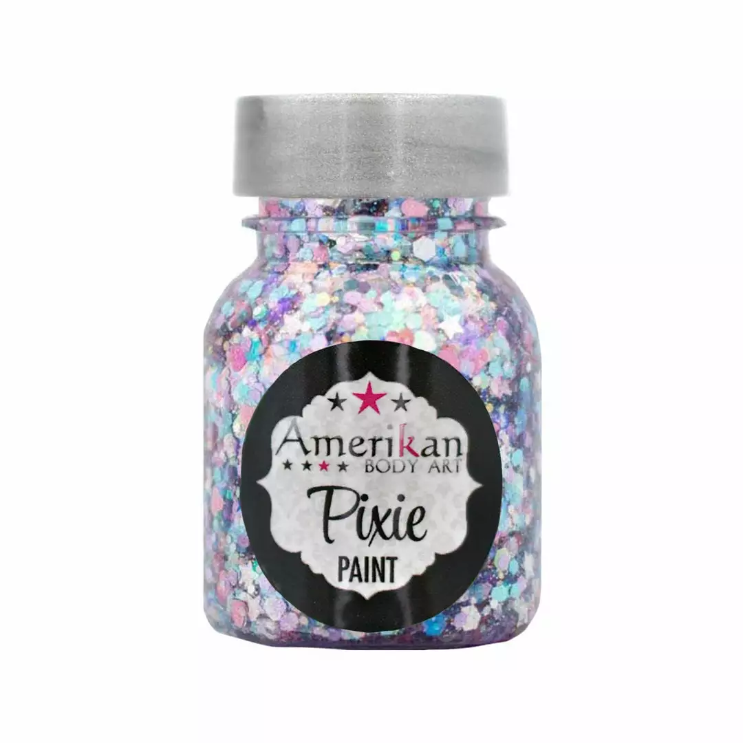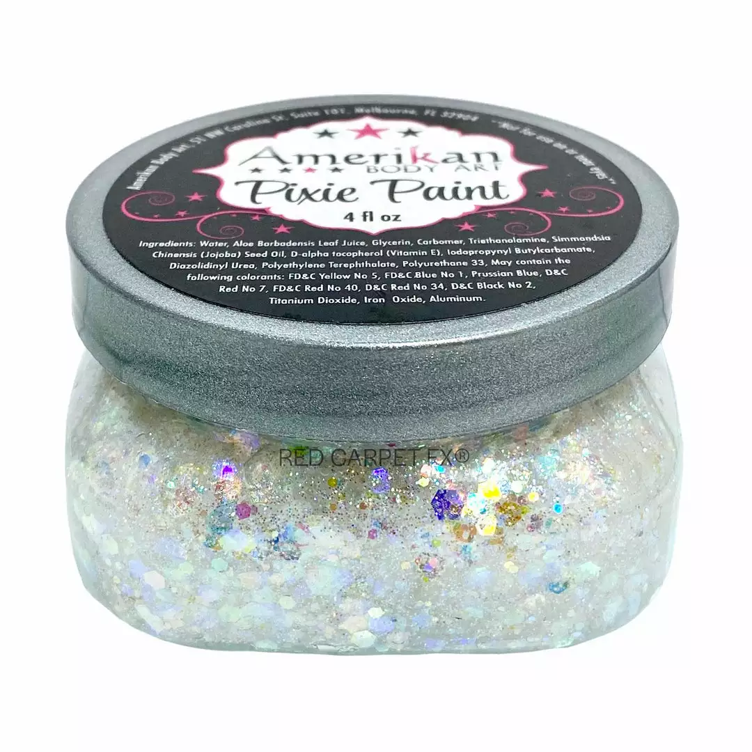 Pixie Paint by Amerikan Body Art is a blend of chunky and fine glitters along with their aloe glitter gel base. It can be painted on the face, body, and hair. Â