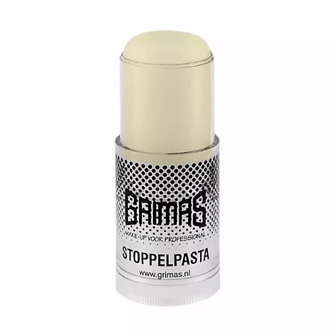 Grimas Stipple Wax (Stoppelpaste) is a sticky paste in stick-form, with which pieces of crepe hair and glitter can be attached to the skin. It can be applied on top of all types of make-up.Â