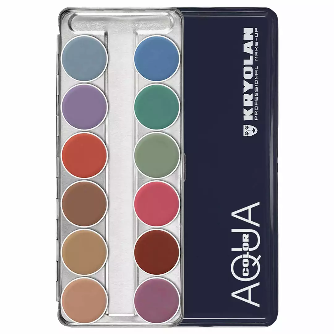 Here is the 12 colour P Palette in Kryolan AQUACOLOR; a glycerine based, water activated make up that is highly pigmented, with superior quality ingredients to its competitors. AQUACOLOR is universally applicable, primarily as a make up for face and body painting, but used in beauty applications too.Â