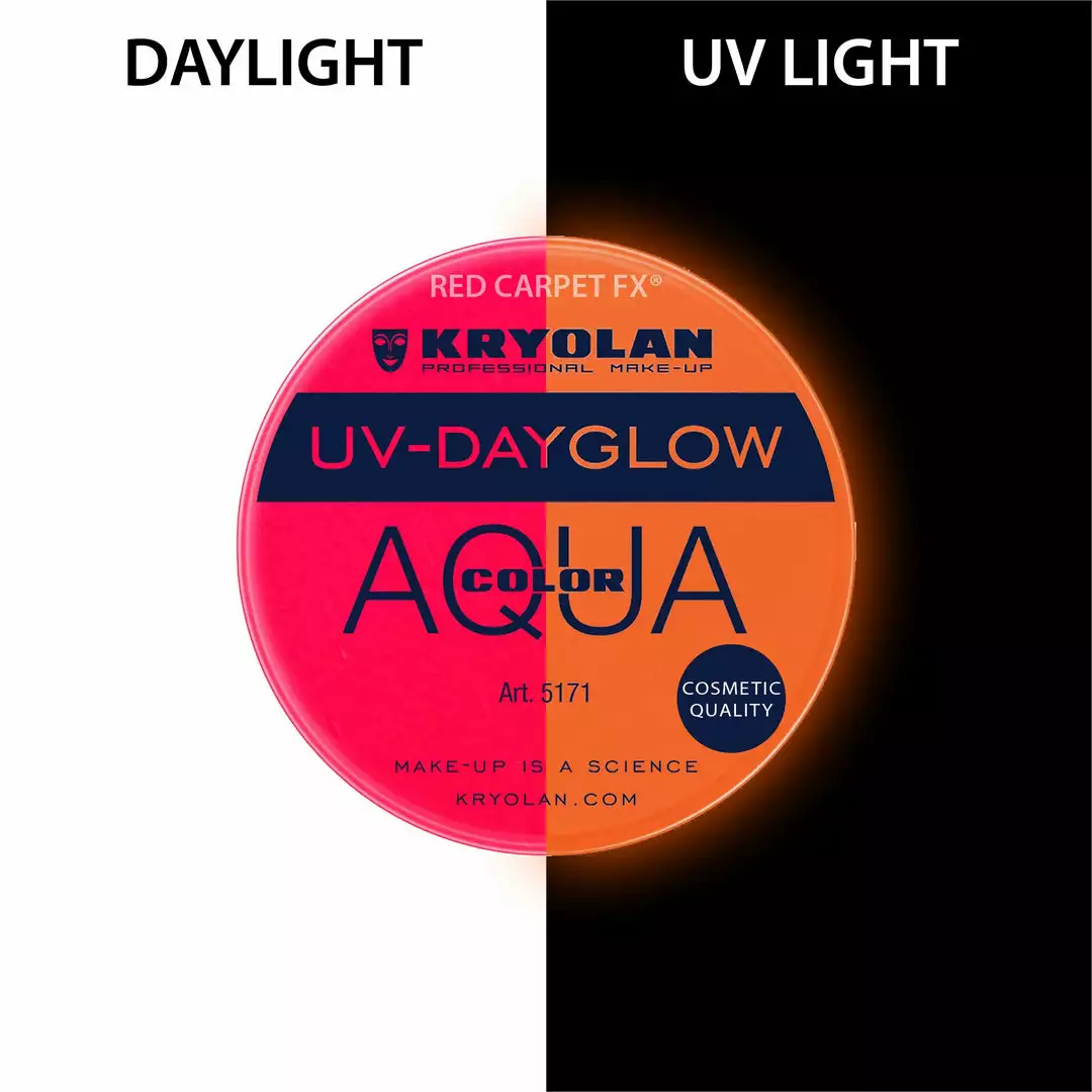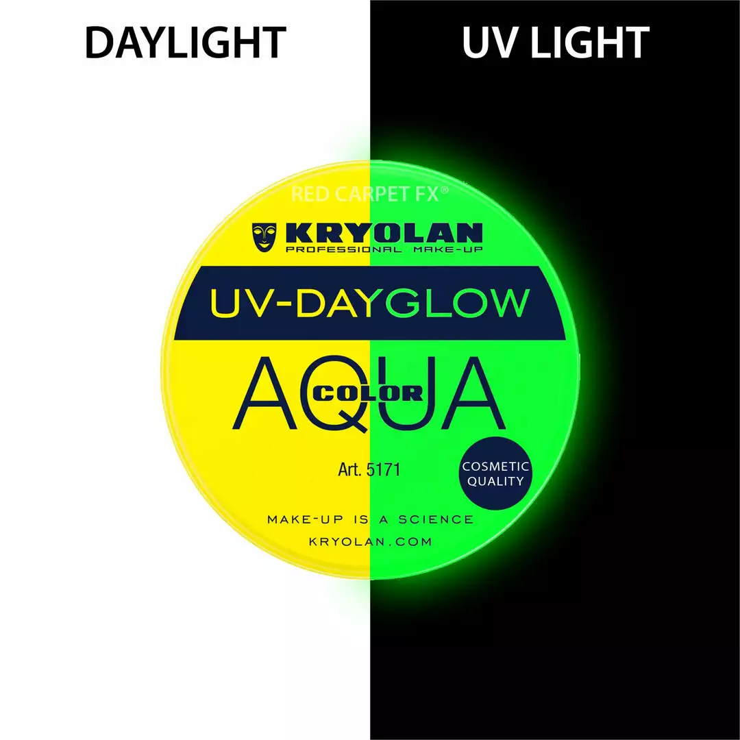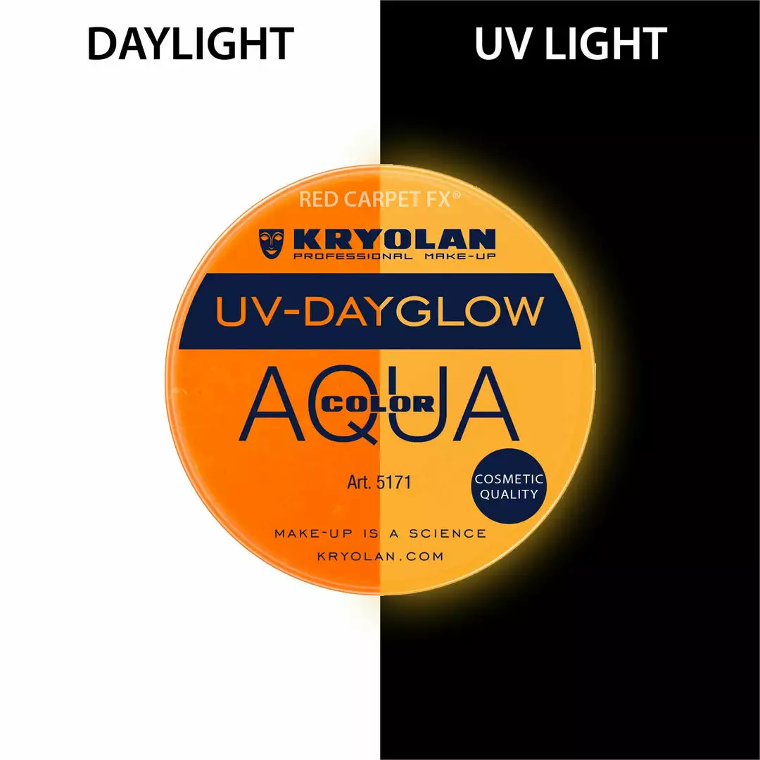 Here are the UV shades as single colour pans in the famous Kryolan AQUACOLOR Dayglow formula; now fully cosmetic grade quality with very strong colour even under normal light. Under UV light sources, the colours glow in completely different intensities. A water activated make up, AQUACOLOR is universally applicable; primarily as a make up for face and body painting, but used in beauty applications too.