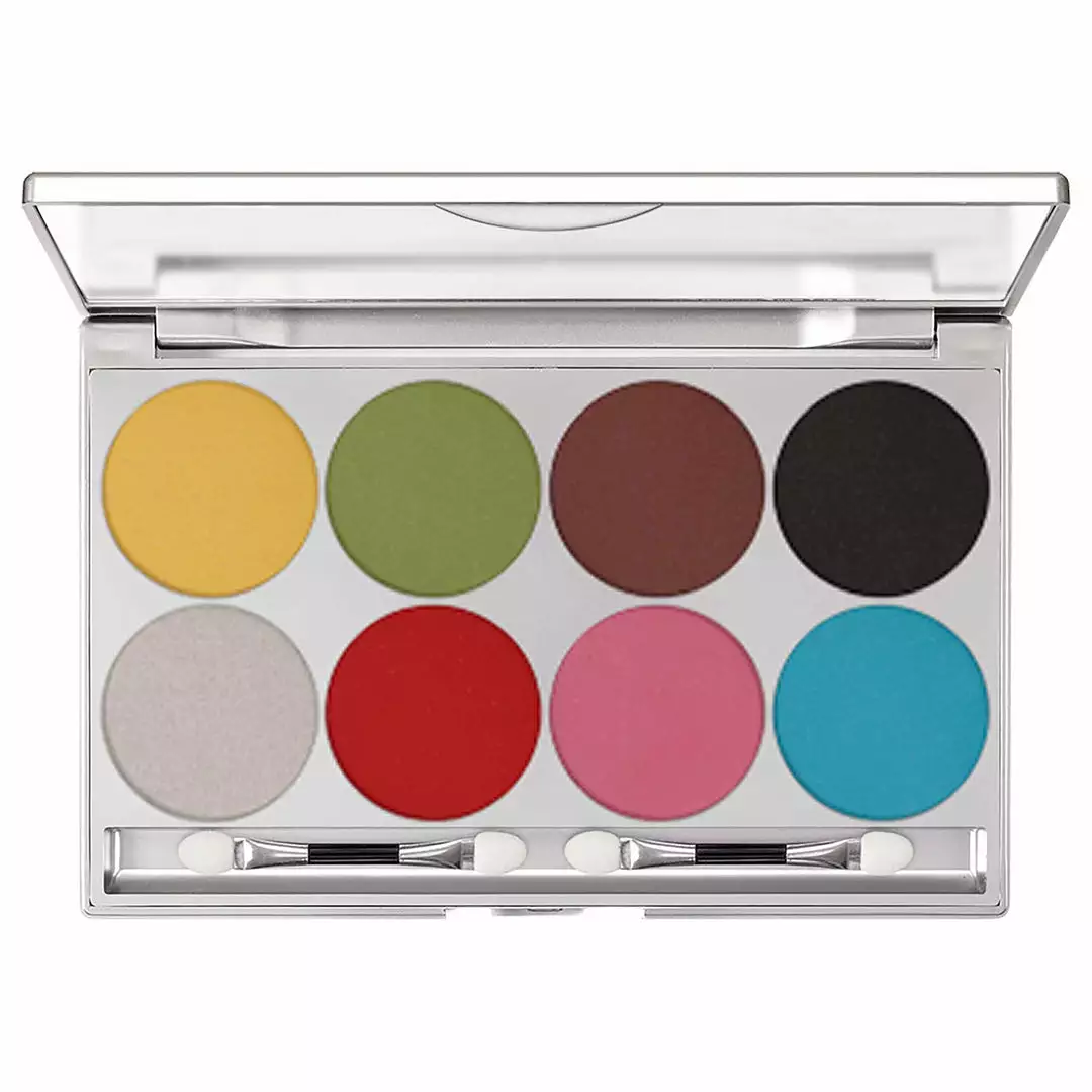 Kryolan Glitter Eyeshadow in an elegant mirror 8 colour palette. Eye Shadow Glitter is a creamy pressed powder for dry application. The exceptional formulation enhances a gentle application and produces a pleasantly soft feeling on the skin.