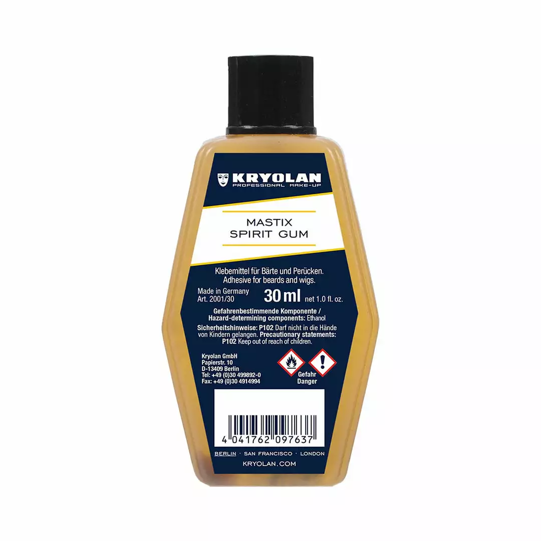 Spirit Gum is a classical adhesive for hair, beards, and wigs, with a very high proportion of natural copal (a natural resin found in tropical trees). It is the favourite of many special fx artists, make-up artists & drag artists around the world because it is an extremely effective adhesive and has been used since the 1890’s as a skin compatible adhesive.