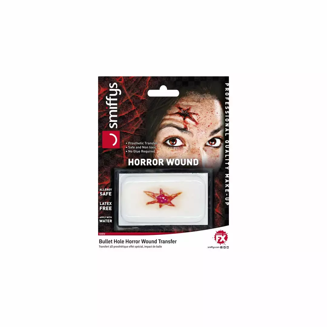 Bullet hole face and body prosthetic that gives a fantastic illusion of a visible realistic bullet entry wound to the skin. Smiffys Horror Wounds Transfers are a water-based prosthetic that is applied the same way as a temporary tattoo; simply remove from packaging apply to skin in the desired location with just water.