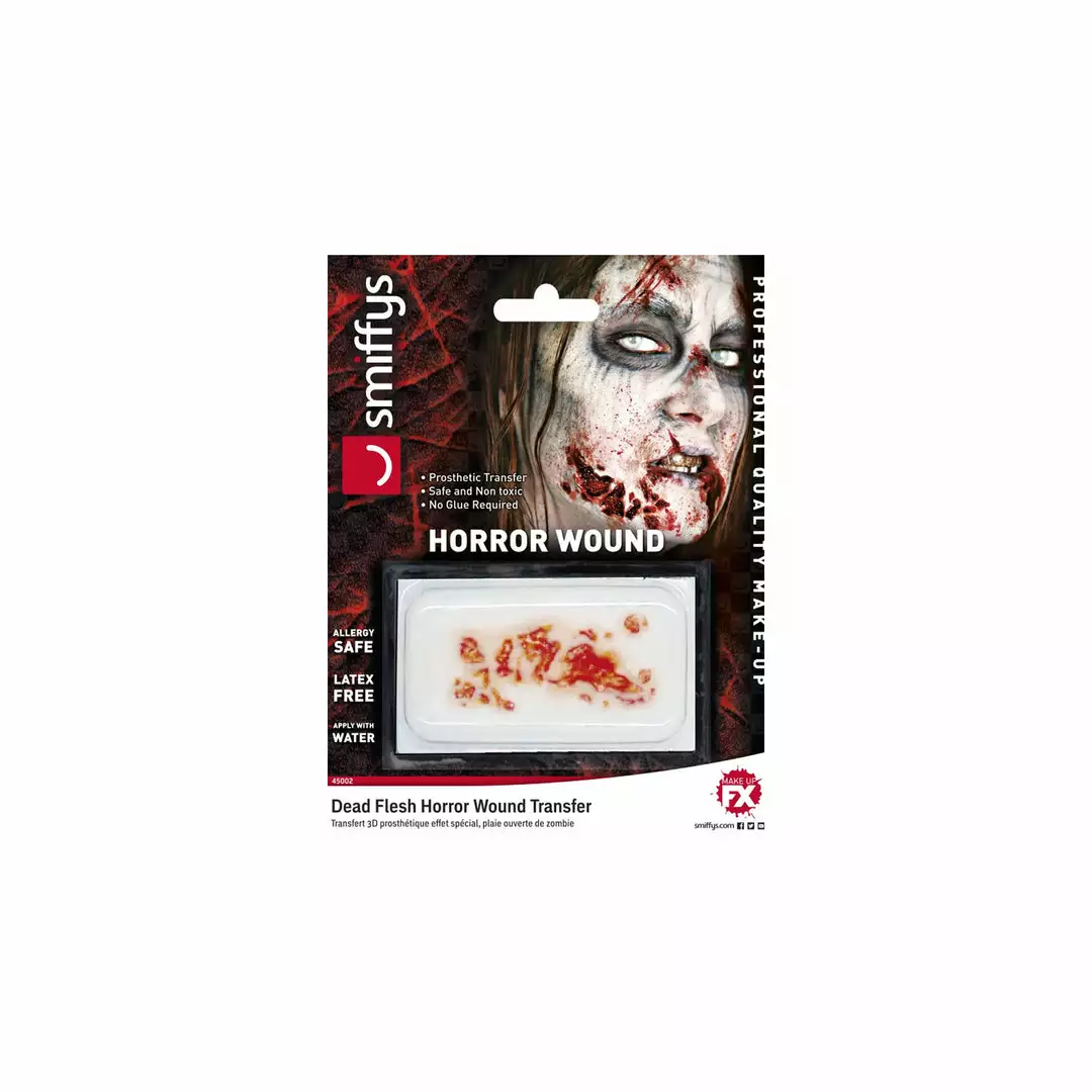 Decaying flesh face and body prosthetic that gives a fantastic illusion of dead and decayed skin with visible lacerations. Smiffys Horror Wounds Transfers are a water-based prosthetic that is applied the same way as a temporary tattoo; simply remove from packaging apply to skin in the desired location with just water.