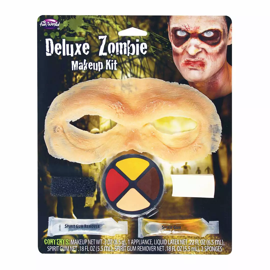 The kit contains 1 x Latex Prosthetic Zombie Eye Piece, 1 x 4 Colour Greasepaint Makeup Tray, 1 x Spirit Gum Adhesive, 1 x Spirit Gum Remover, 1 x Latex Sponge & 1 x Small Stipple Sponge.