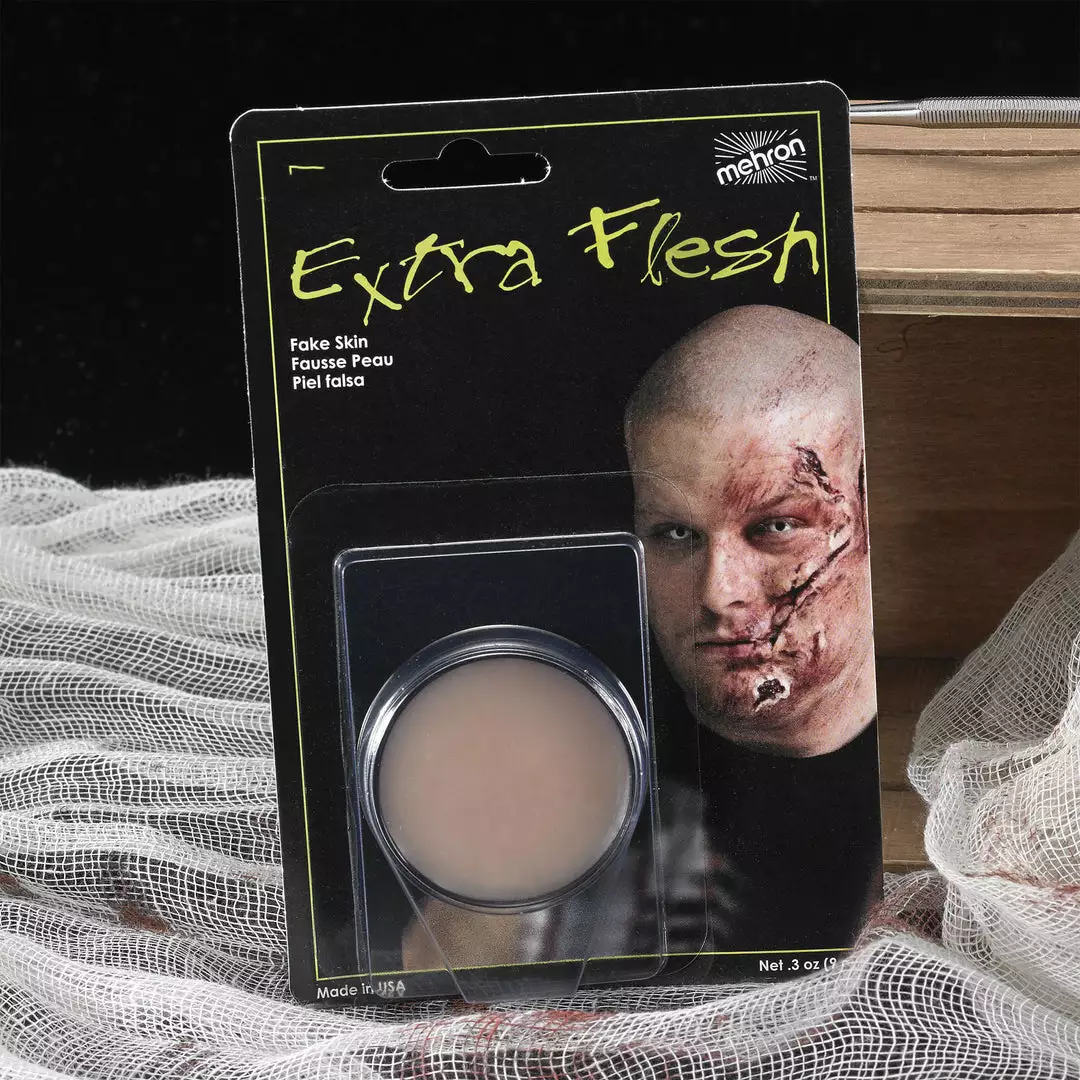 This Extra Flesh Special Effects Makeup is easy to use; just rip off a chunk, dab it on and blend it out. This special Extra Flesh by Mehron can be applied with a safe non-toxic adhesive, Fixative A or Spirit Gum which is used by Special Effect Makeup Artists throughout the entertainment world. Extra Flesh is a synthetic makeup product that can be reused and is easy to apply and remove. Extra Flesh is an exclusive formulation of the Mehron makeup Company.