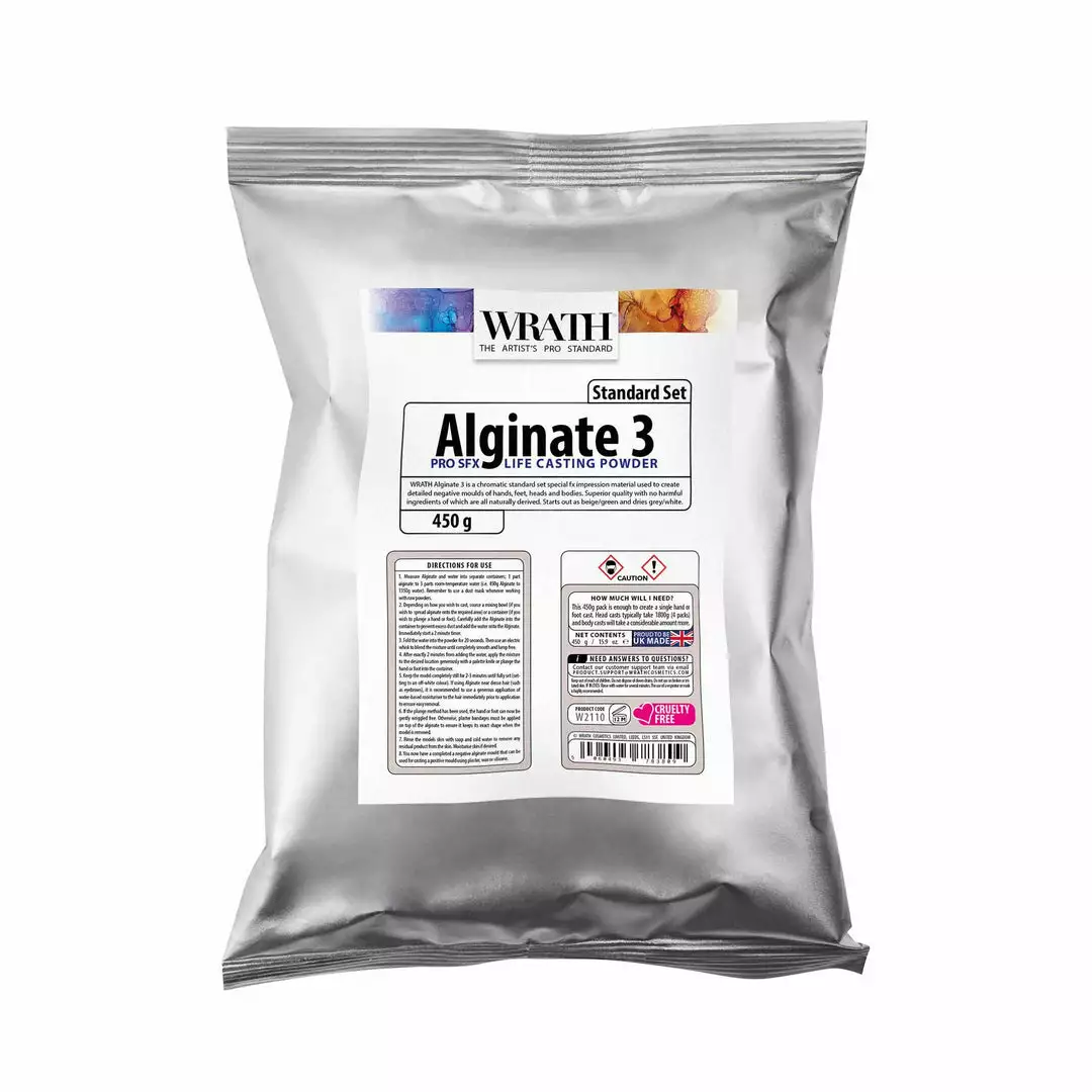 WRATH Alginate 3 is a chromatic standard set special fx impression material used to create detailed negative moulds of hands, feet, heads and bodies. Superior quality with no harmful ingredients of which are all naturally derived. Starts out as beige/green and dries grey/white.Â