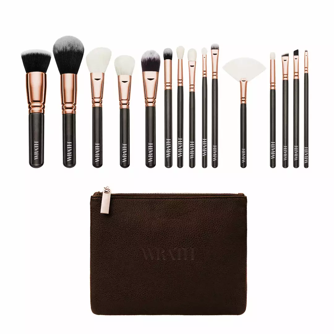 WRATH Rose Gold Artist Brush Set is a superior quality set containing 15 essential brushes all contained in a faux leather brush bag.