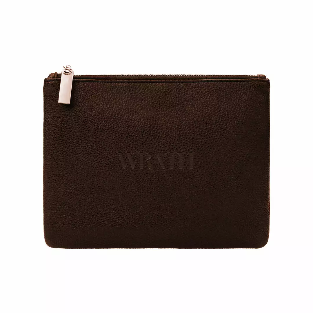 The included WRATH Faux Leather Brush Bag is made from high durability synthetic leather in chocolate brown with a fine golden silk-feel lining with internal zipped pocket.
